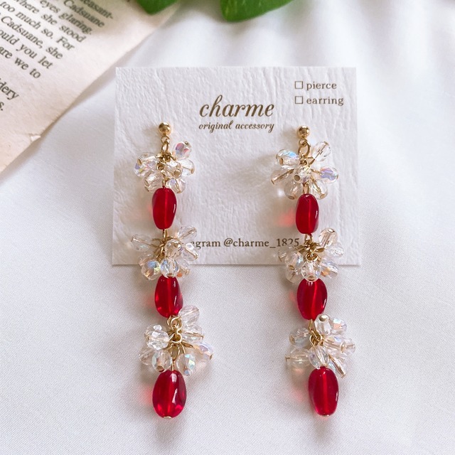 ■長さ 6㎝ ■金具 通常金具サージカルステンレスピアス ■イヤリング変更、金具変更ご希望の方は、ご購入時に必ずイヤリング選択をお願い致します。 ご購入後の変更はいたしかねますので、お間違えのないようお願い致します。 ■赤いツイスト、クリスタルチェコビーズがきらきらとさりげない存在感の揺れる大人可愛いアイテムになります。 ************************* □charme accessory お読み下さい。 刺繍など一つ一つ丁寧に縫い付けて仕上げております。 全て同じになるように制作しておりますが、多少の個体差はハンドメイドなのでご理解の程よろしくお願い致します。 なるべく同じように丁寧に制作しております。 刺繍アクセサリーの裏処理は、接着剤で貼り付け、周りをピッグスキンを使用しブランケットステッチで縫ってあります。 ピッグスキン(豚革)は、薄くて汚れを拭き取りやすいので耳に優しいです。 無理な力や、強い衝撃を与えないようにして下さい。 □ピアス金具はサージカルステンレスを使用しております。 使用後は、皮脂や汚れを拭き取り保管して頂くと、長くきれいなままお使いいただけます。 □コットンパールや金具などは、国産の質の良い物をしようしております。 最後までお読みいただきありがとうございました♪ □ご質問等ございましたらお気軽にお声掛けください❤︎ 素敵なご縁がありますように⭐︎