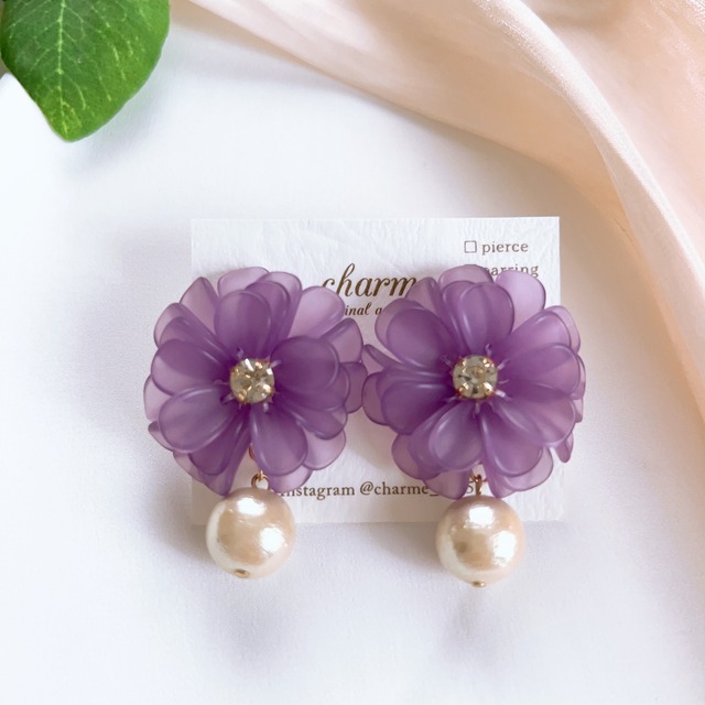 ■長さ 上から4.5㎝ 耳下から1㎝ ■金具 通常金具サージカルステンレスポストピアス ※イヤリング変更ご希望の方は、ご購入時に必ずイヤリング選択をお願い致します。 ご購入後の変更はいたしかねますので、お間違えのないようお願い致します。 □アクリルフラワーとゴールドのコットンパールの大人可愛いアイテムになります。 とても軽くて着けやすくおすすめです。 ************************* □charme accessory お読み下さい。 刺繍など一つ一つ丁寧に縫い付けて仕上げております。 全て同じになるように制作しておりますが、多少の個体差はハンドメイドなのでご理解の程よろしくお願い致します。 なるべく同じように丁寧に制作しております。 刺繍アクセサリーの裏処理は、接着剤で貼り付け、周りをピッグスキンを使用しブランケットステッチで縫ってあります。 ピッグスキン(豚革)は、薄くて汚れを拭き取りやすいので耳に優しいです。 無理な力や、強い衝撃を与えないようにして下さい。 □ピアス金具はサージカルステンレスを使用しております。 使用後は、皮脂や汚れを拭き取り保管して頂くと、長くきれいなままお使いいただけます。 □コットンパールや金具などは、国産の質の良い物をしようしております。 □海外製のパーツやカボションには、多少の傷がある事もございますが、ご了承の程よろしくお願い致します。 □商品画像と異なるサイズの台紙になる場合があります。 商品や箱に合わせて、お客様に喜んで頂ける様、台紙サイズを合わせてアクセサリーにセッティングしております。 写真と同じサイズご希望の方は、ご購入時にメッセージ下さい。 最後までお読みいただきありがとうございました♪ □ご質問等ございましたらお気軽にお声掛けください❤︎ 素敵なご縁がありますように⭐︎