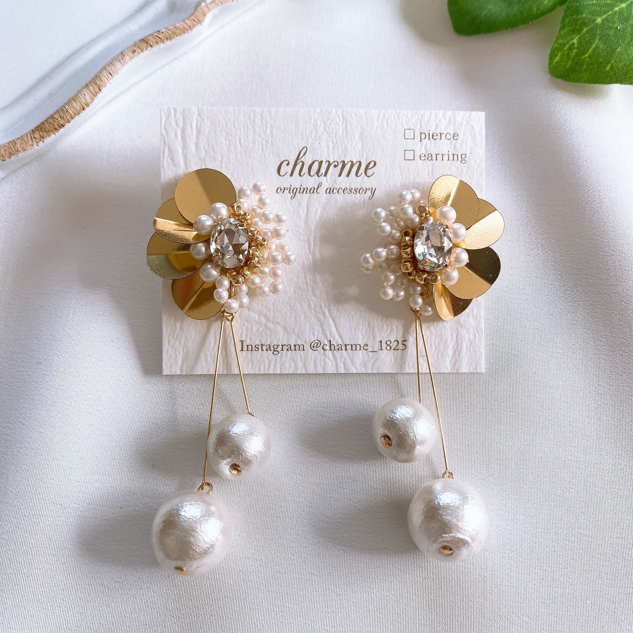 下に華奢なジョイントパーツにサイズの違うコットンパールを揺れるようにつけました。