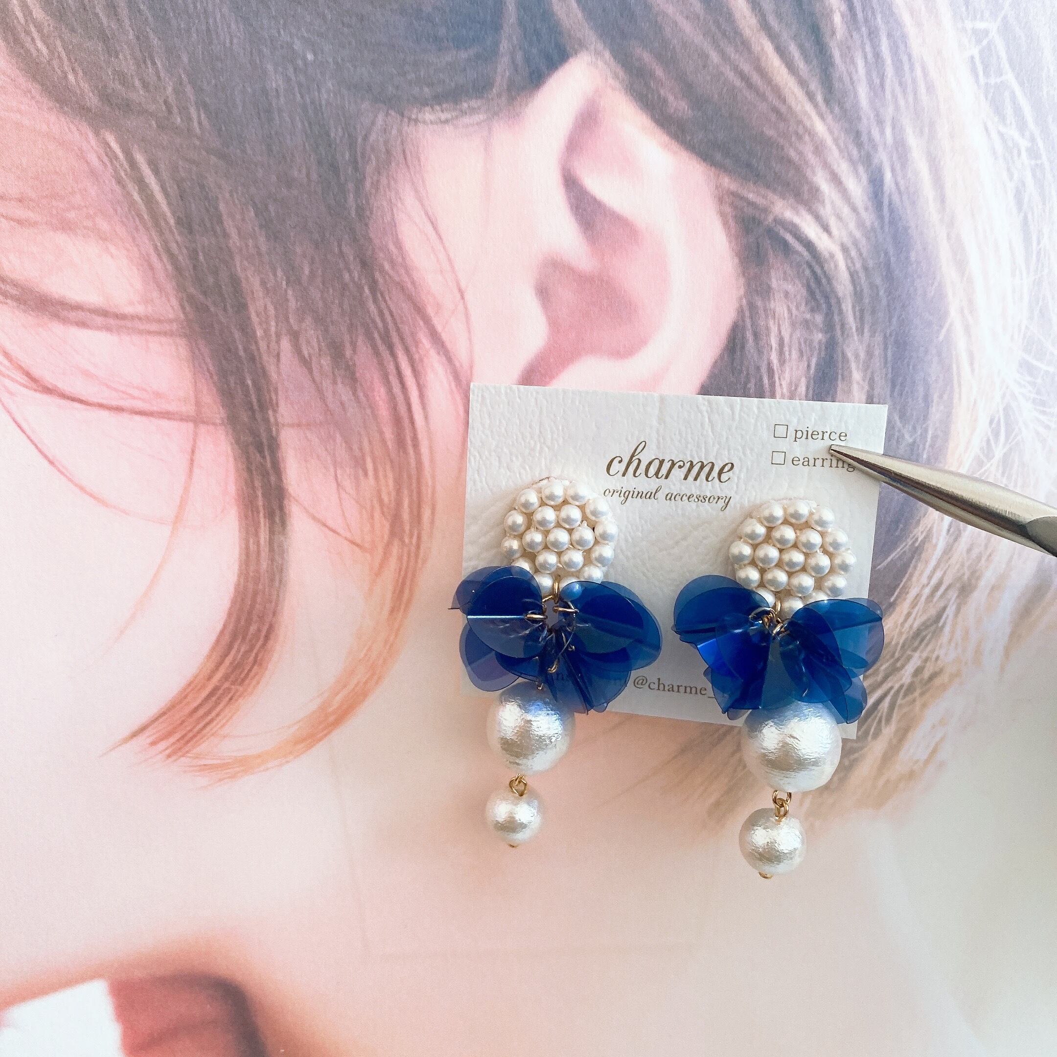 耳元には、ホワイトのシルキーパールを刺繍しました。