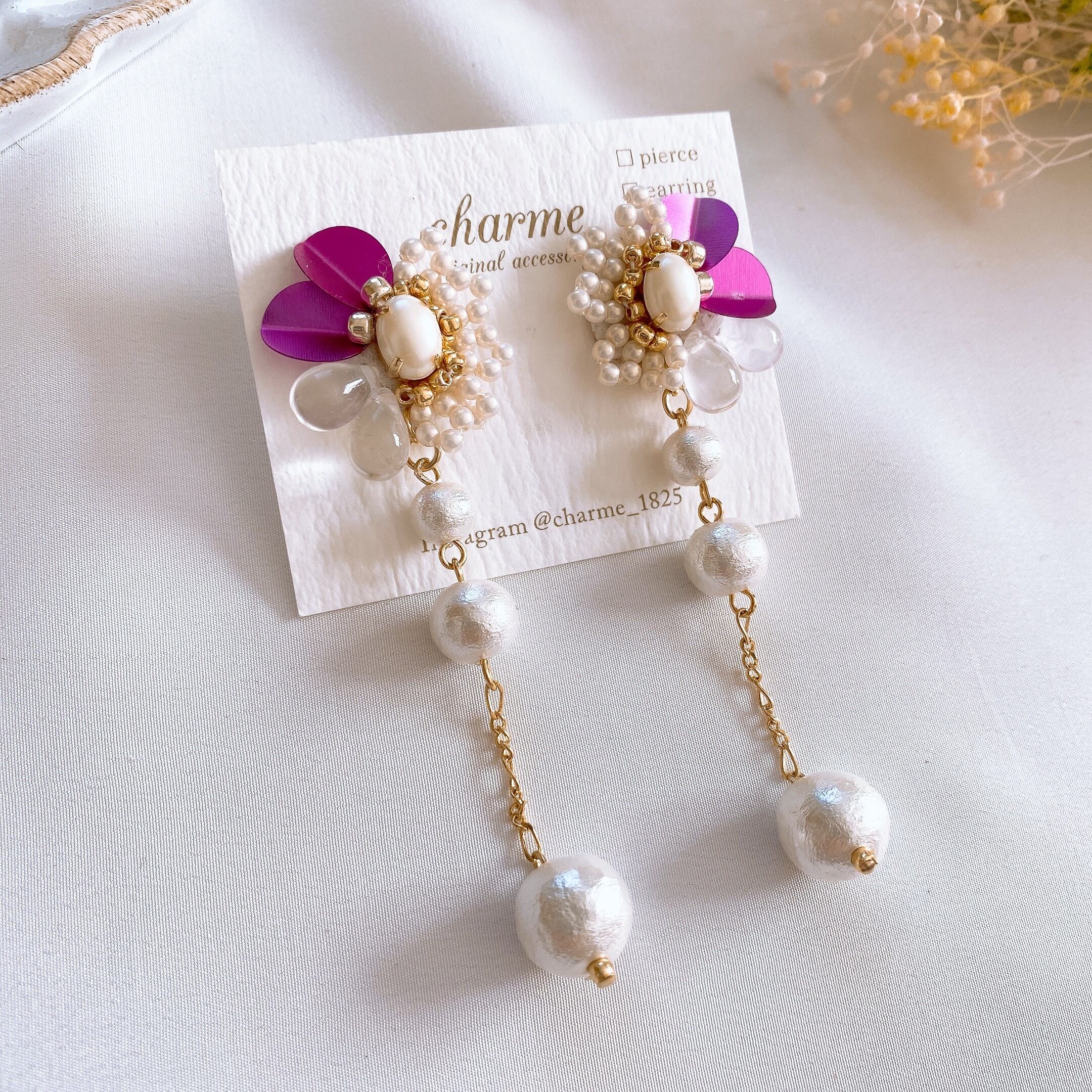 耳元は、台座付きパールの周りにスパンコール、チェコビーズ、シルキーパールを縫い付け、下にホワイトのコットンパールを繋げました。