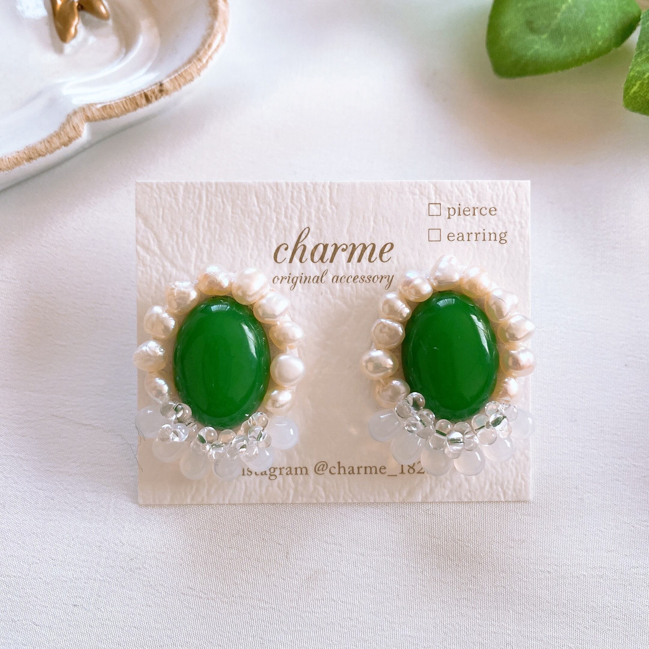 グリーンのオーバルカボションに、チェコビーズと淡水パールを一つ一つ縫い付けたアイテムになります。