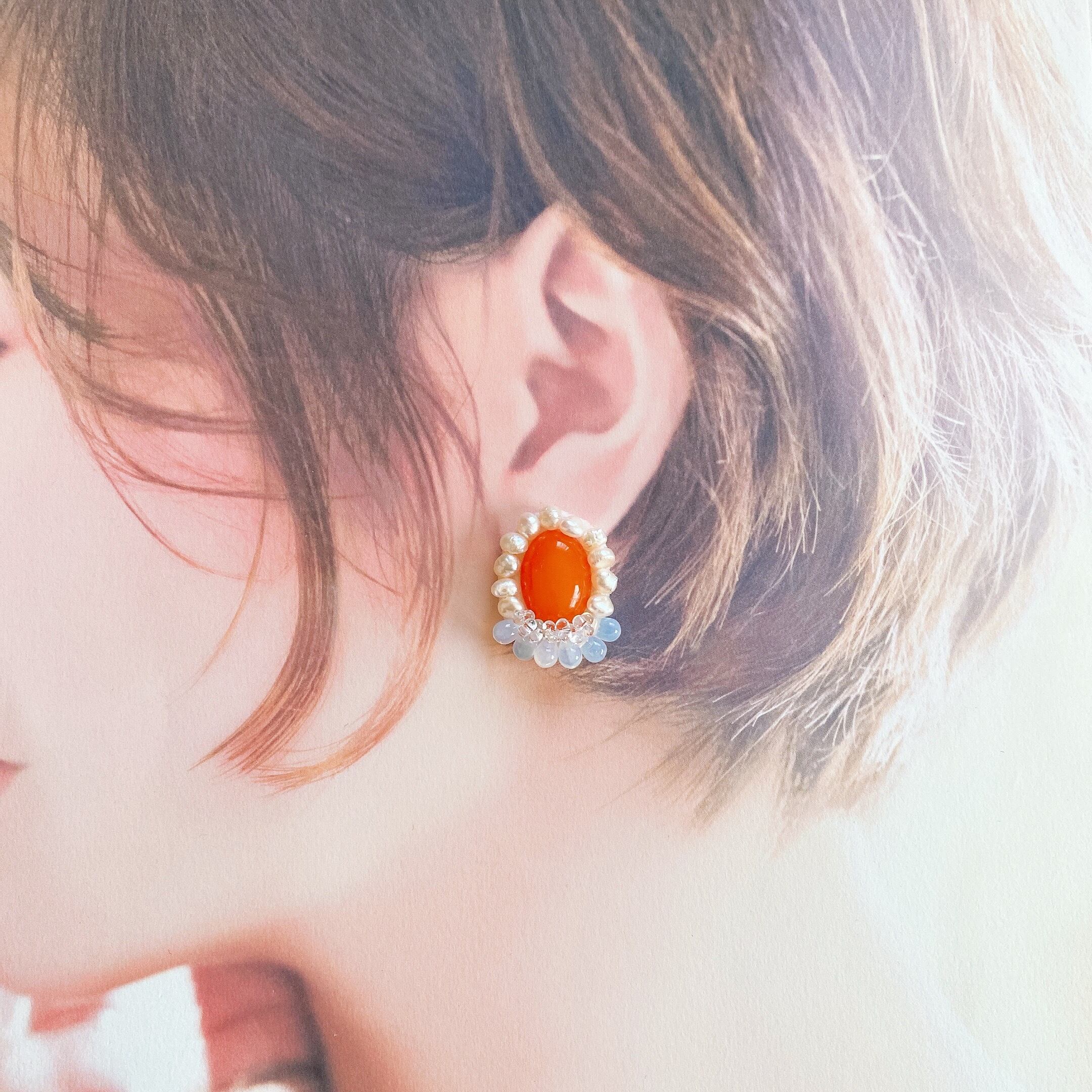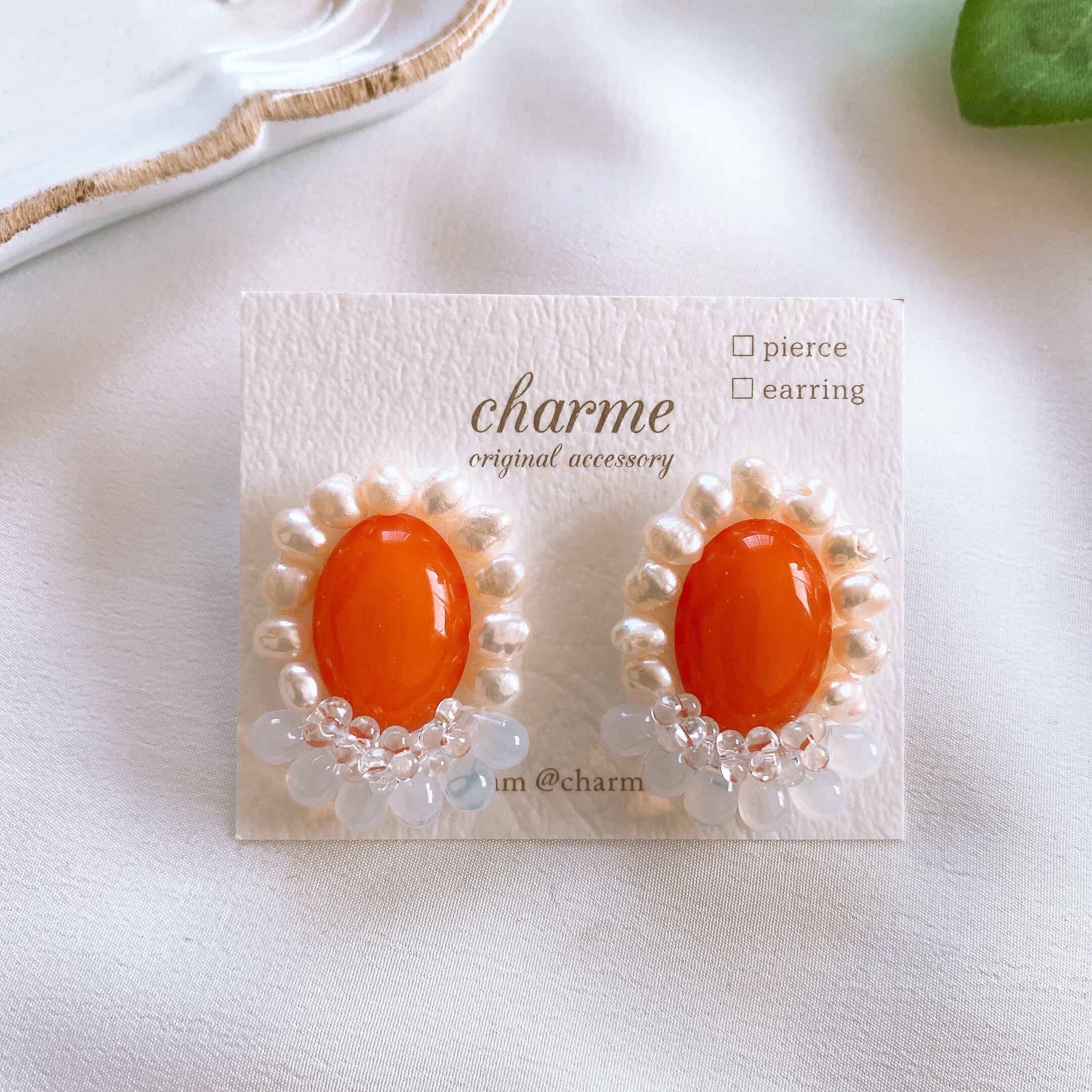 オレンジのオーバルカボションに、チェコビーズと淡水パールを一つ一つ縫い付けたアイテムになります。
