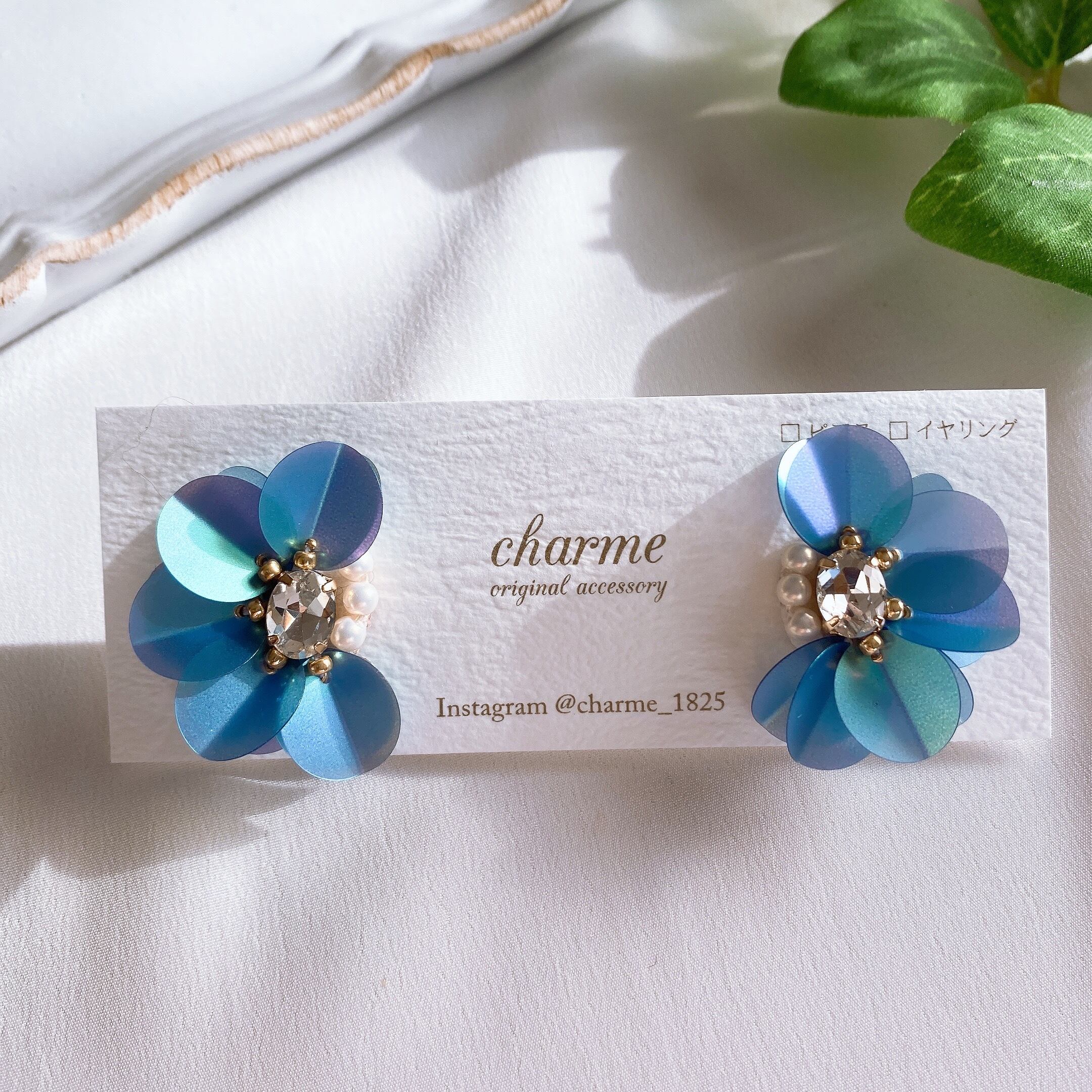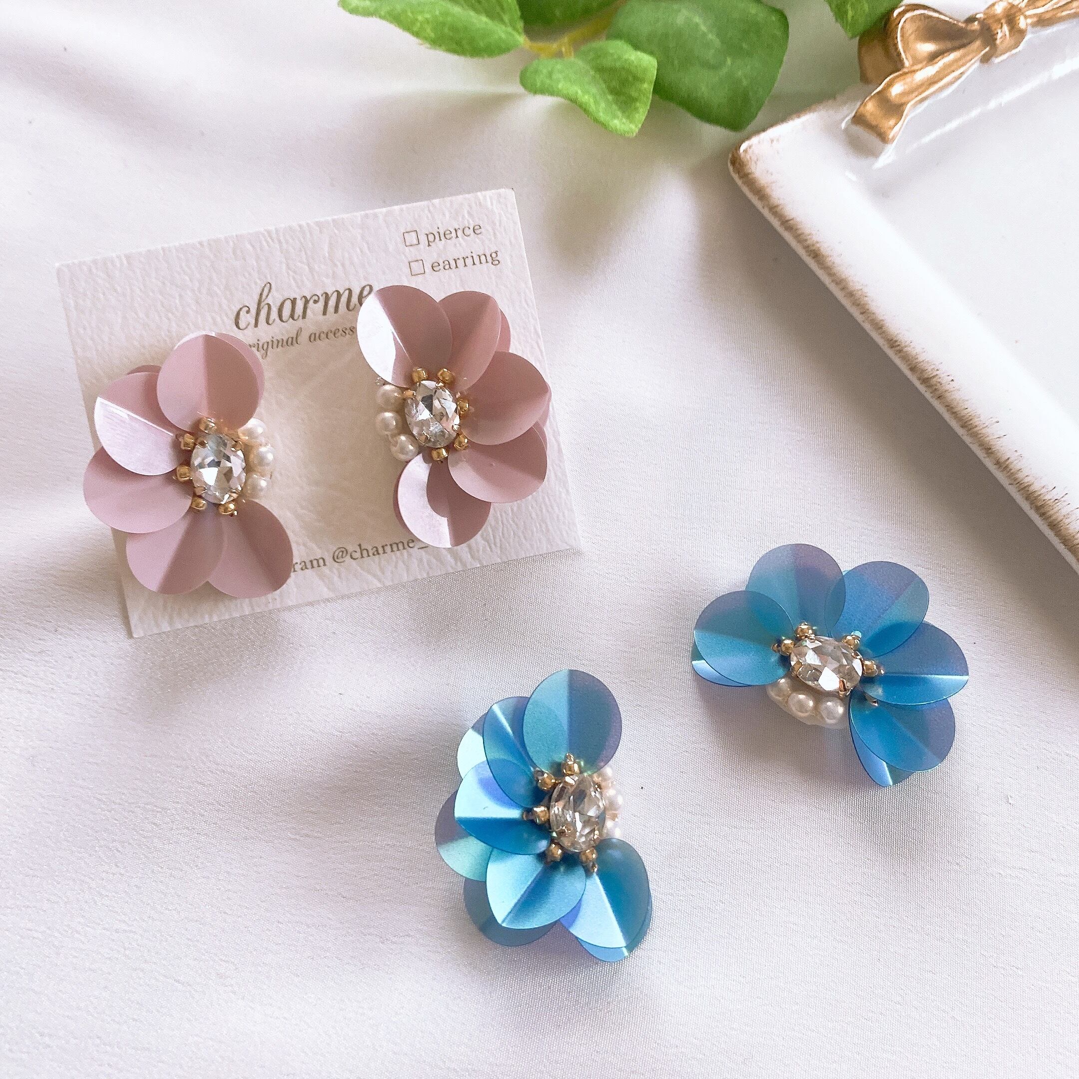 オーバル型のクリスタルガラスストーンとスパンコールの大人可愛いピアス/イヤリングになります。
