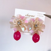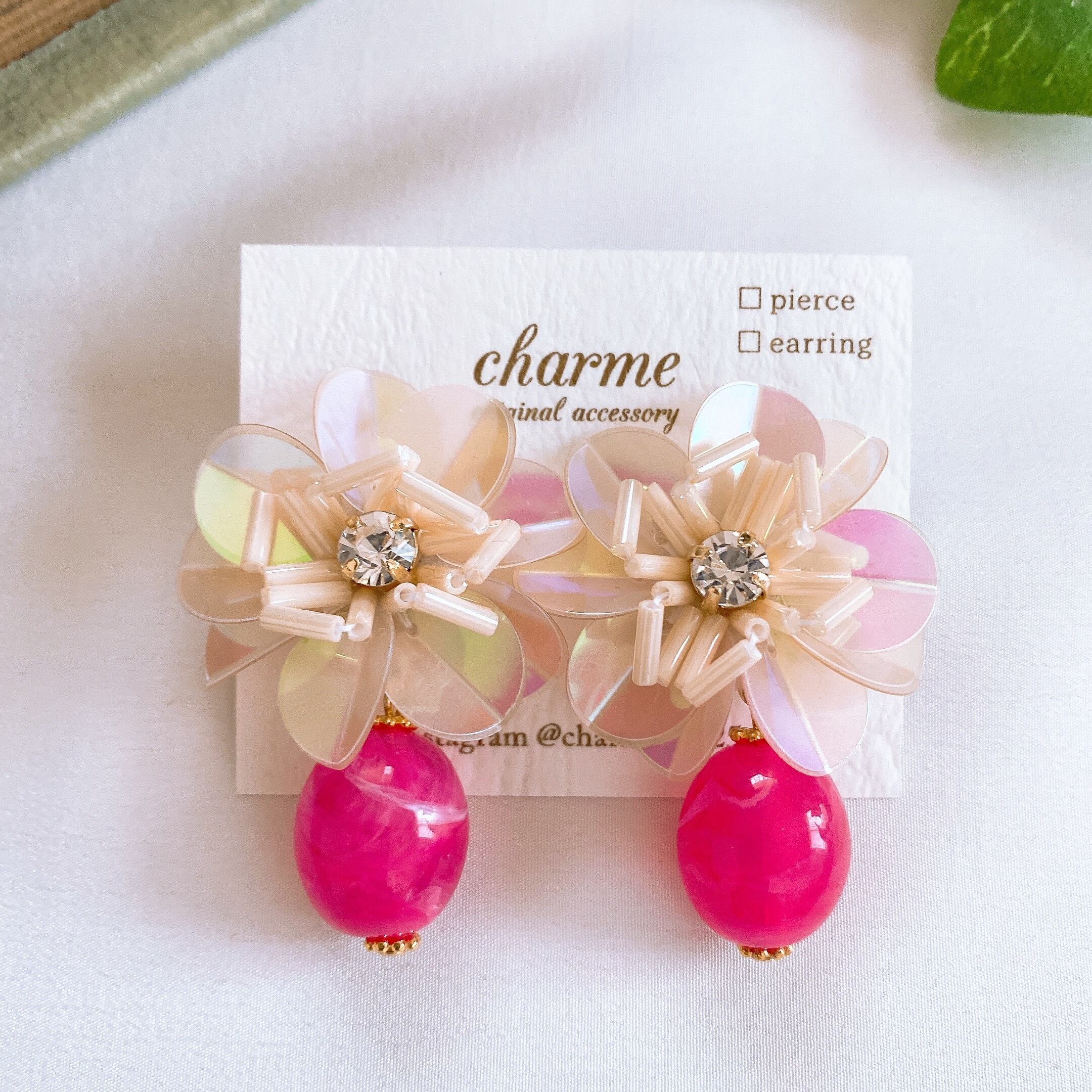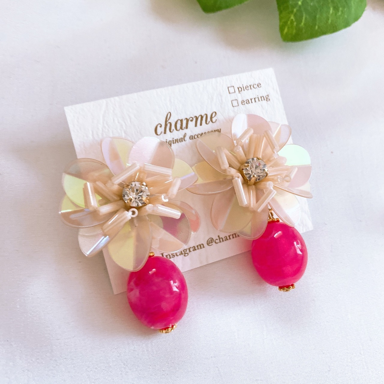 一粒のピンクのアクリルビーズがさりげなく揺れて大人可愛いアイテムになります。