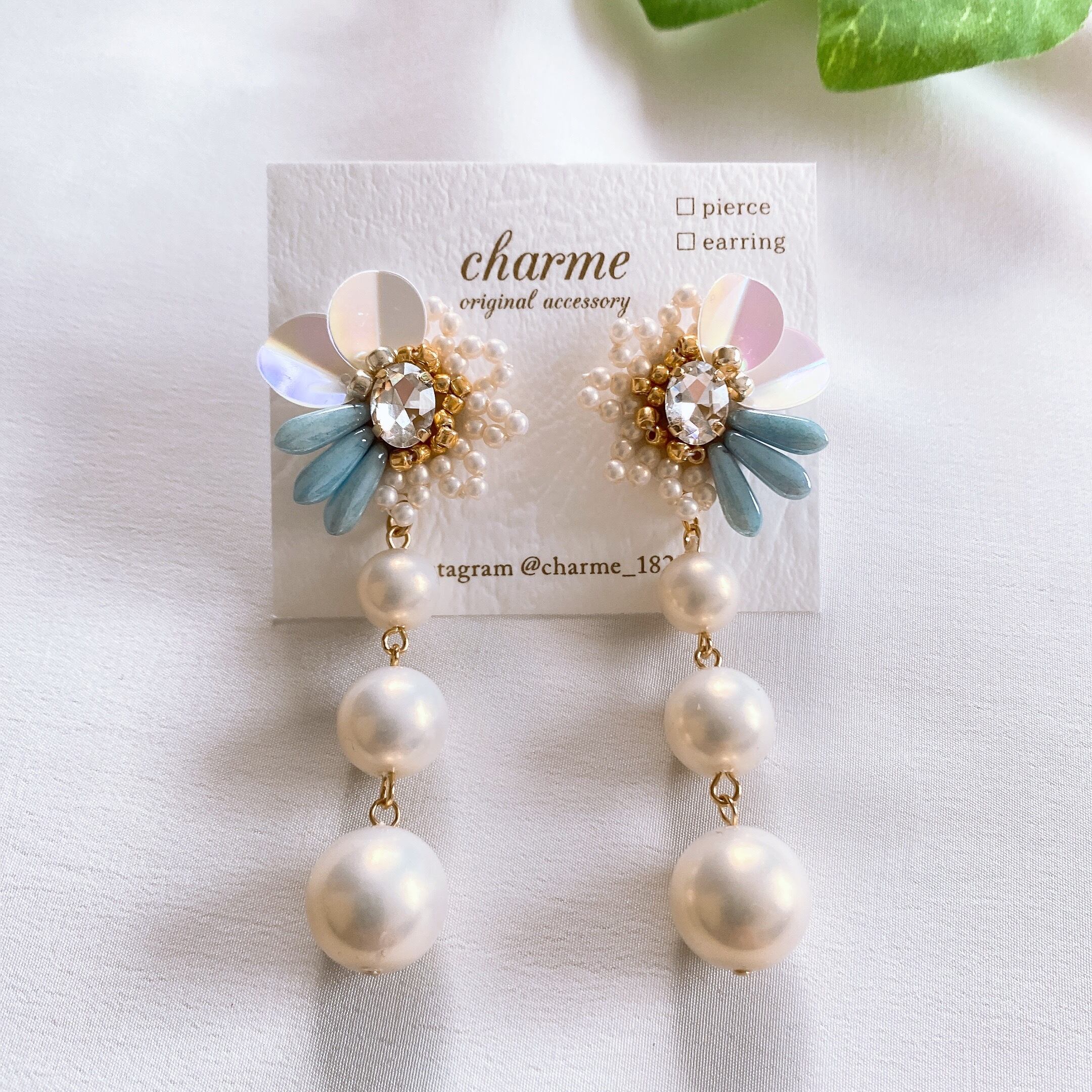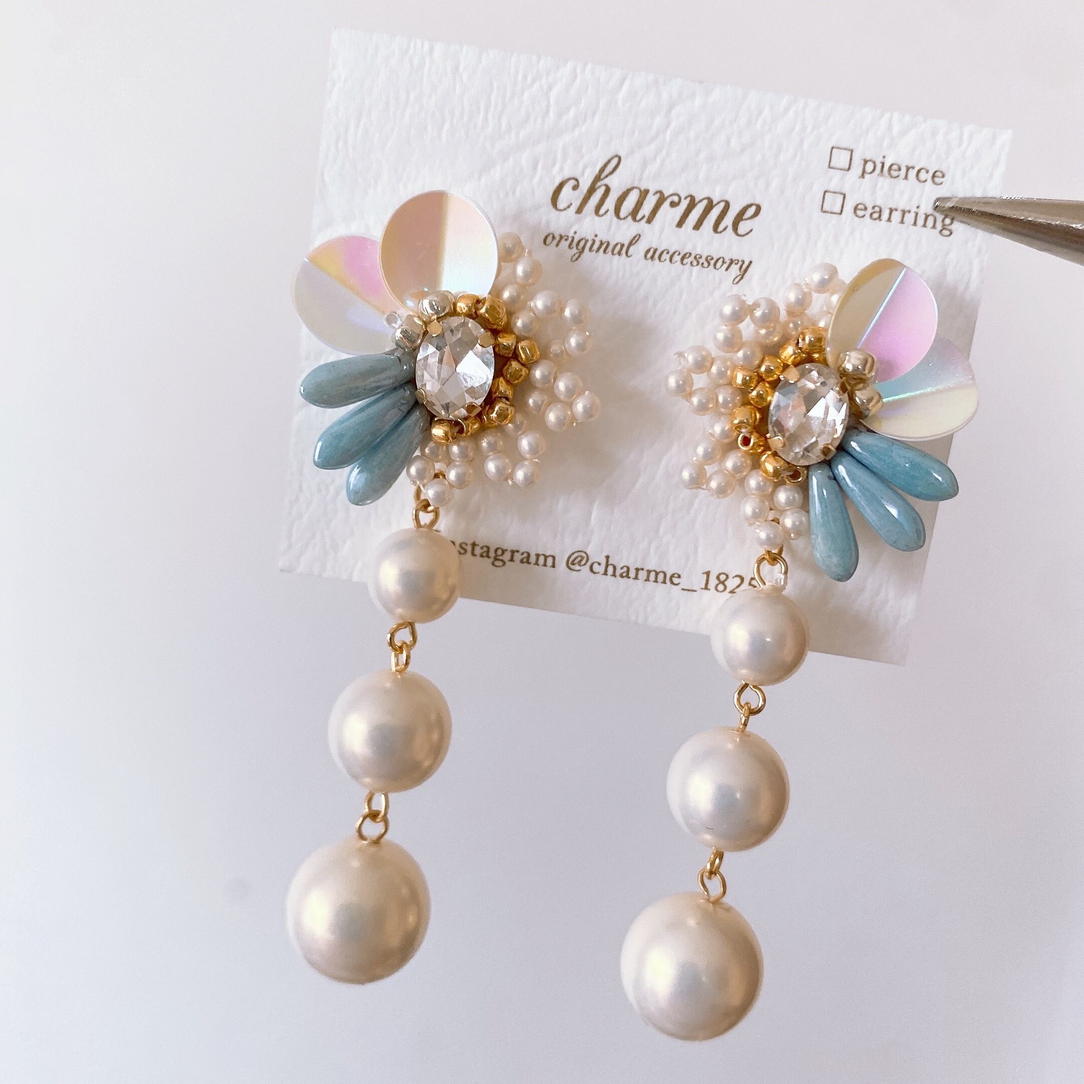 □パールストーンの周りに、チェコビーズ、スパンコール、シルキーパールを縫い付けて、下には3連のシルキーパールを揺れる様に付けて大人可愛く仕上げました。