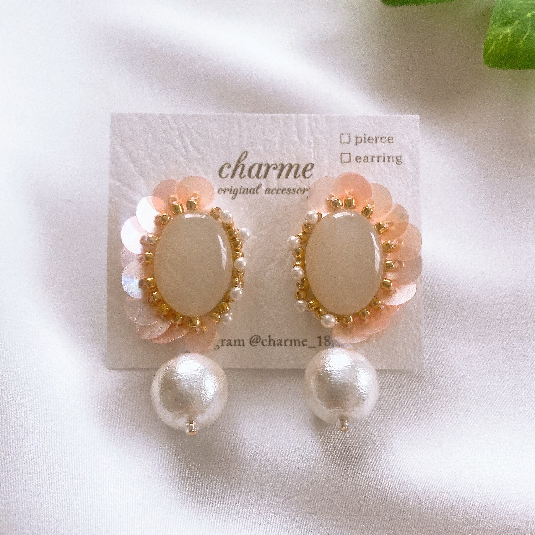 ■シェル風オーバルカボションに、淡いオレンジ色のスパンコールときれいなゴールドの銅玉を縫い付けました。