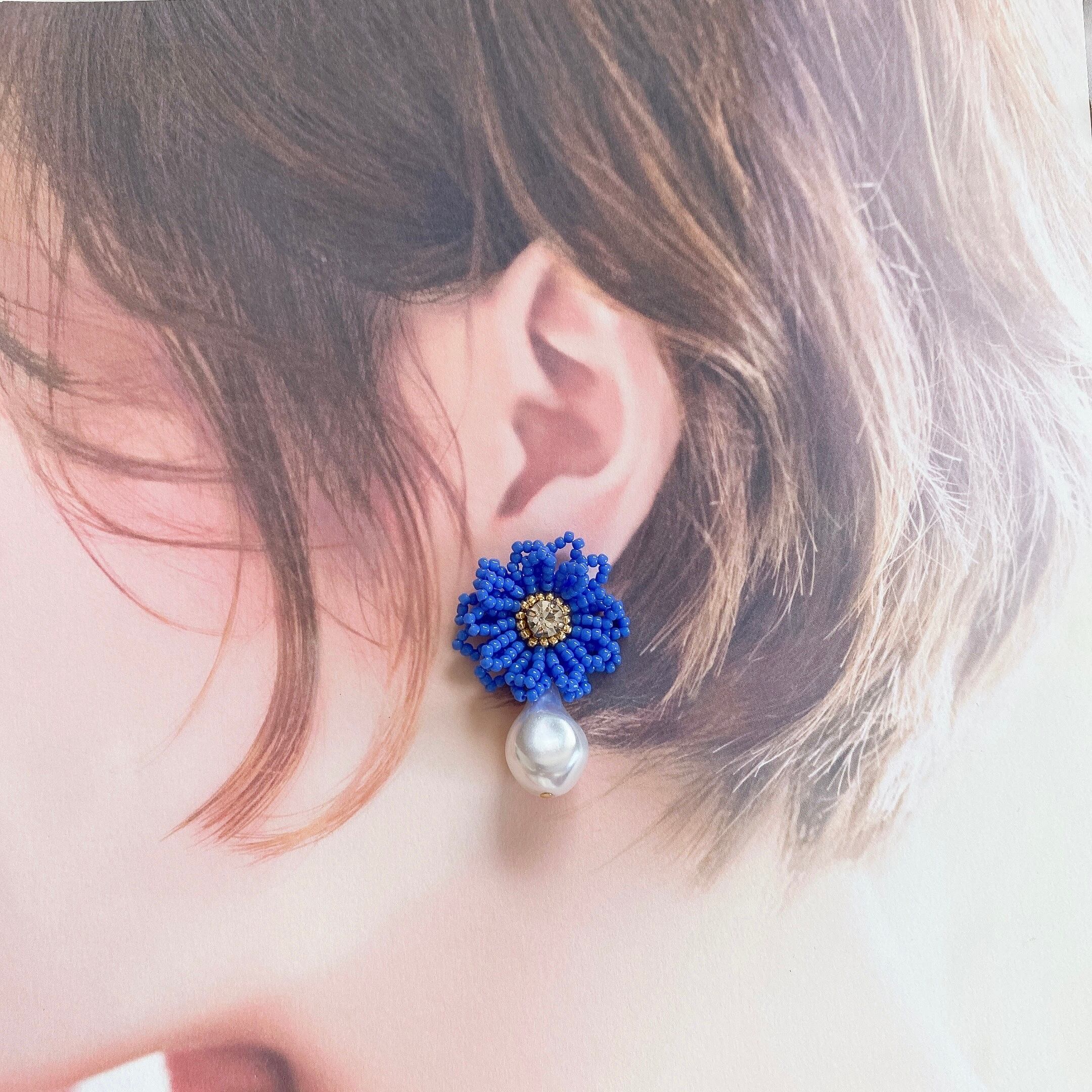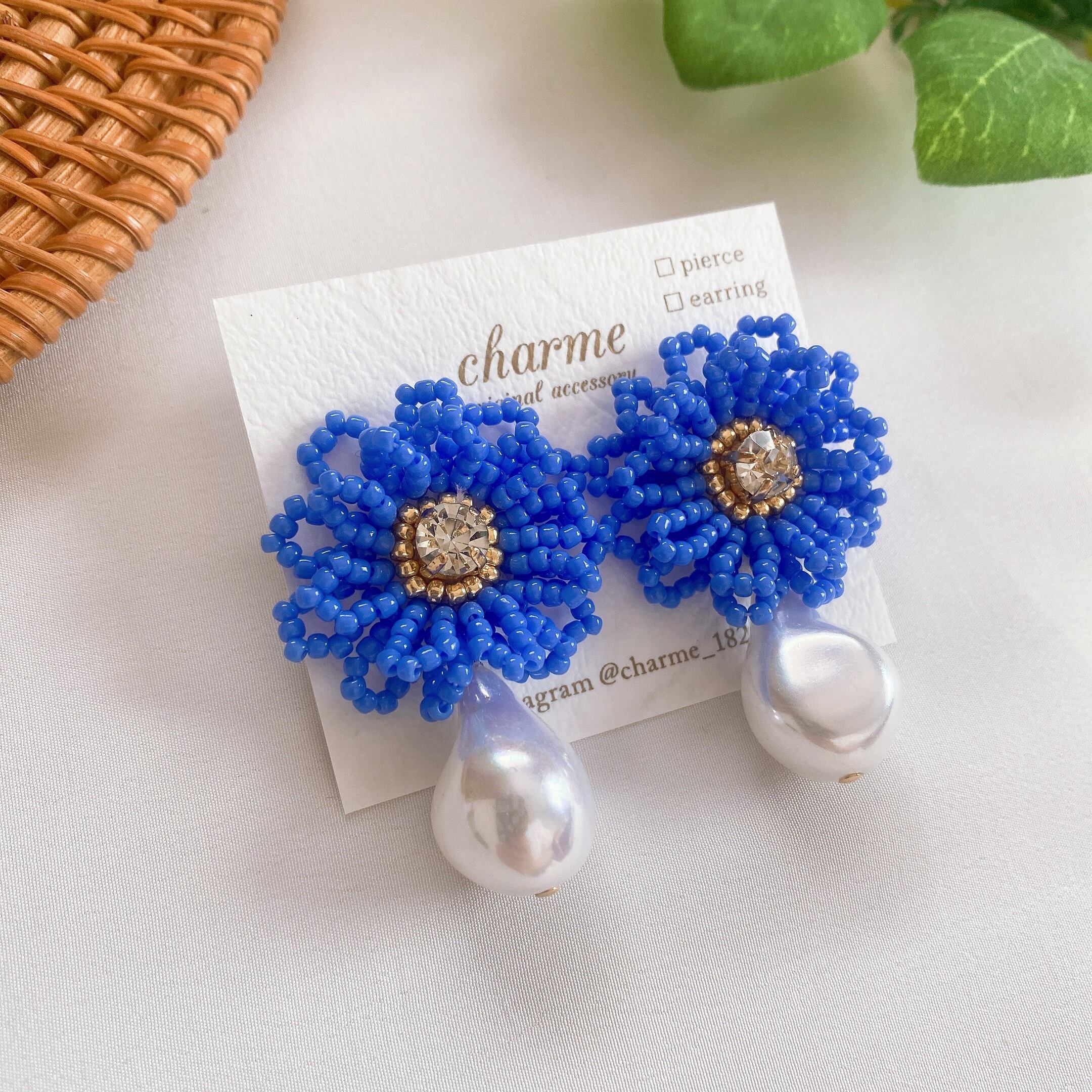 ■ブルーのシードビーズを刺繍し、下にはパールを縫い付けた大人可愛いアイテムになります。