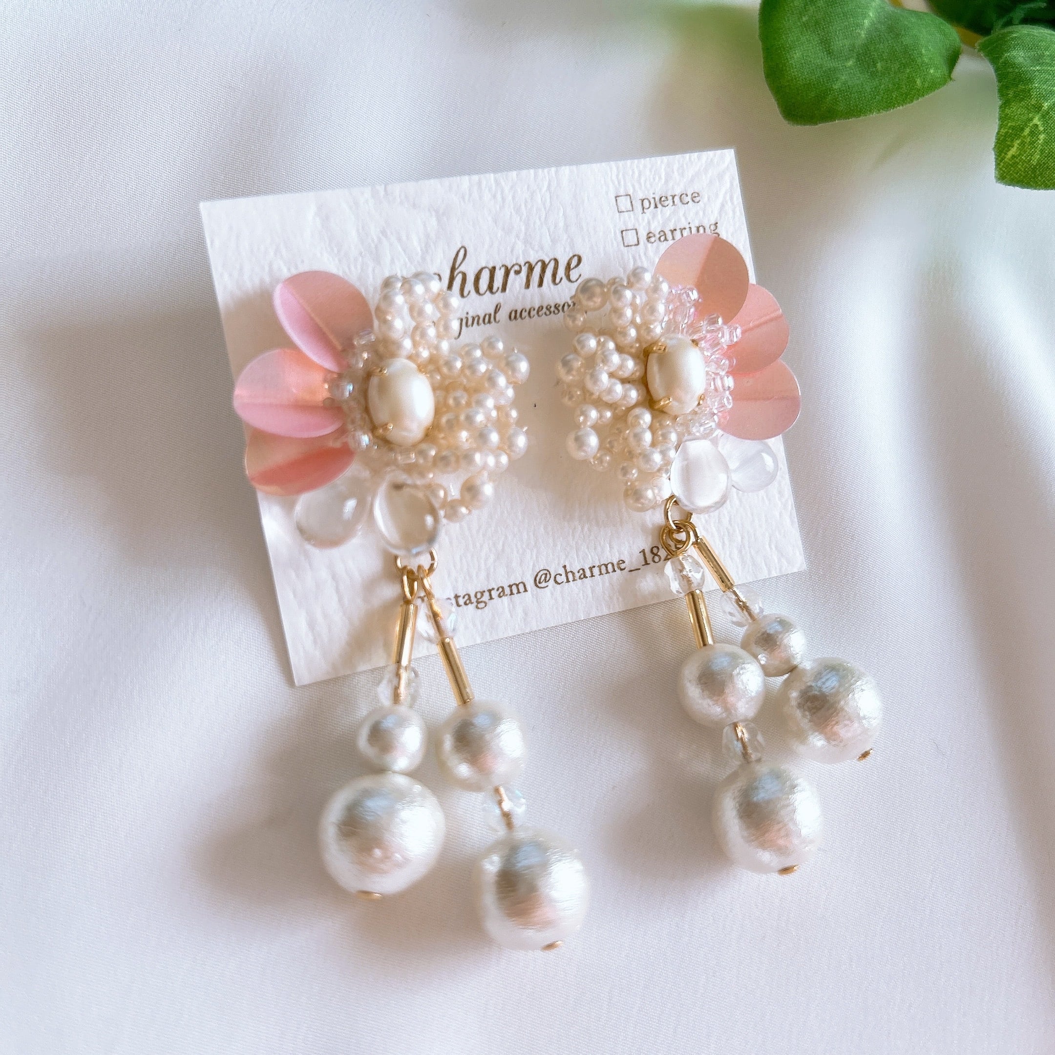 下にはコットンパールを付け、さりげなく存在感を出してくれるアイテムにしました。